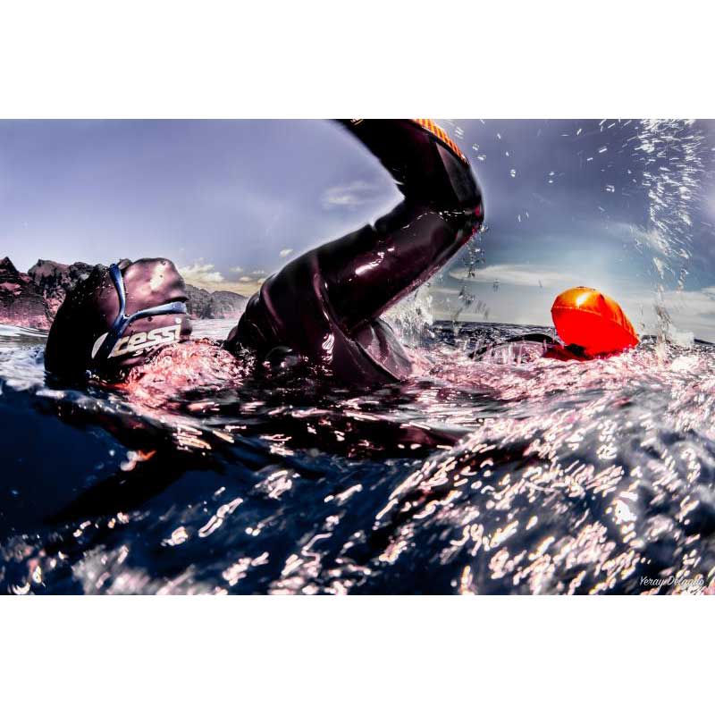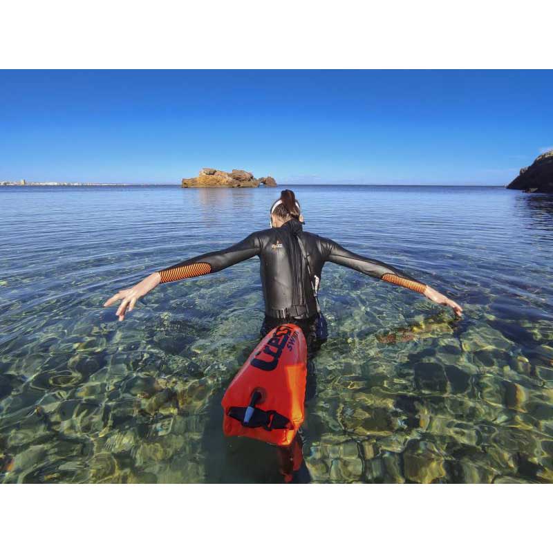 – Material de color rojo anaranjado flúor de gran visibilidad para aumentar la visibilidad del nadador en el agua.